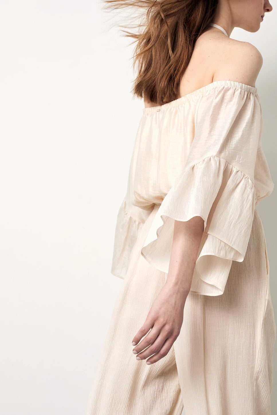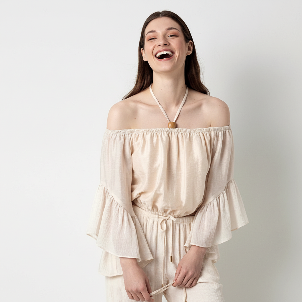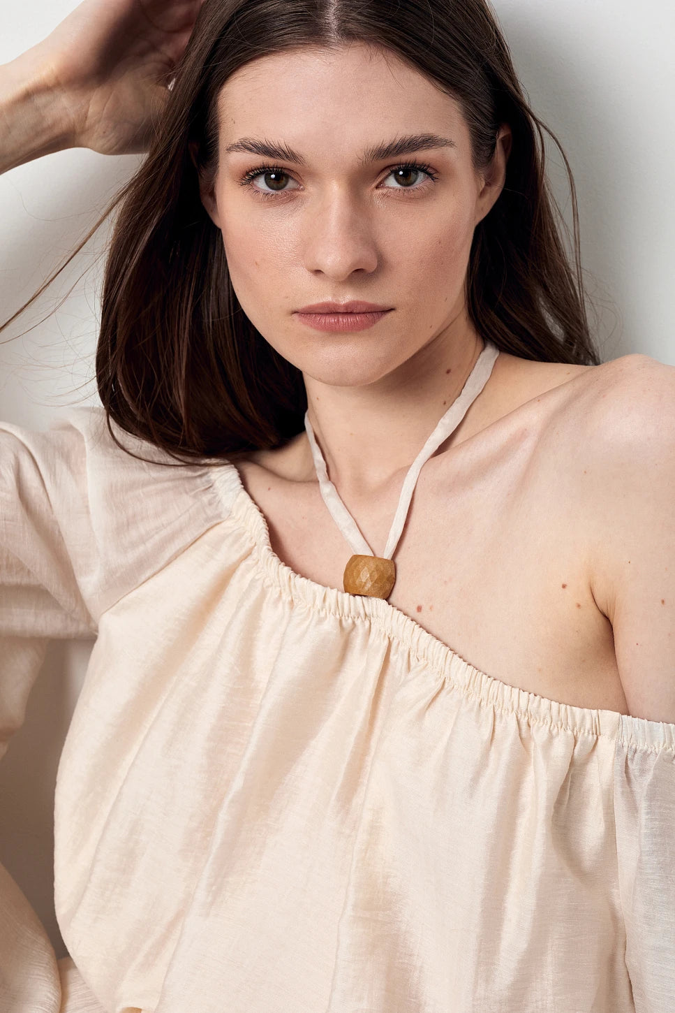 Détail en perle sur le décolleté avec lien à nouer au cou.