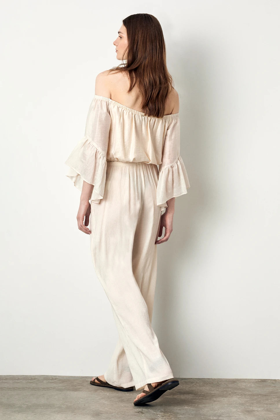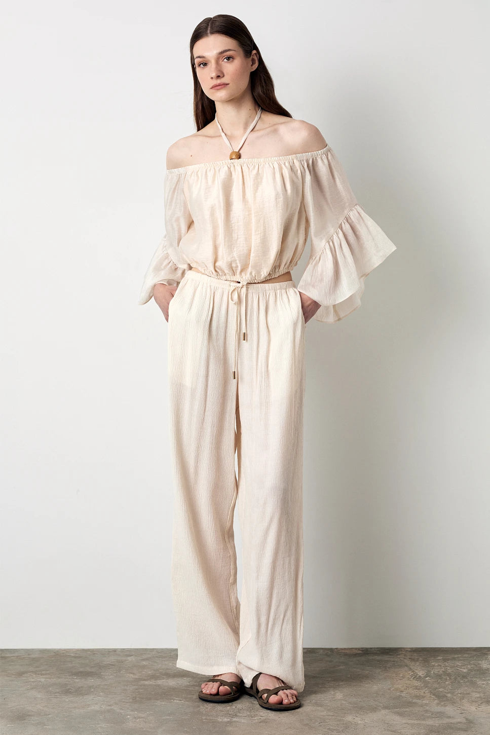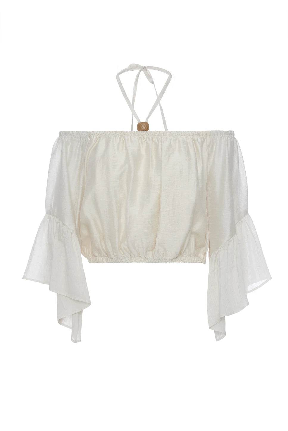 Détail en perle sur le décolleté avec lien à nouer au cou.