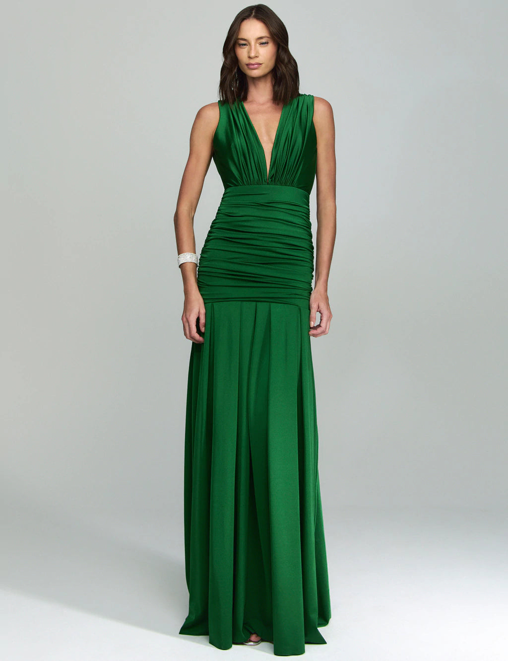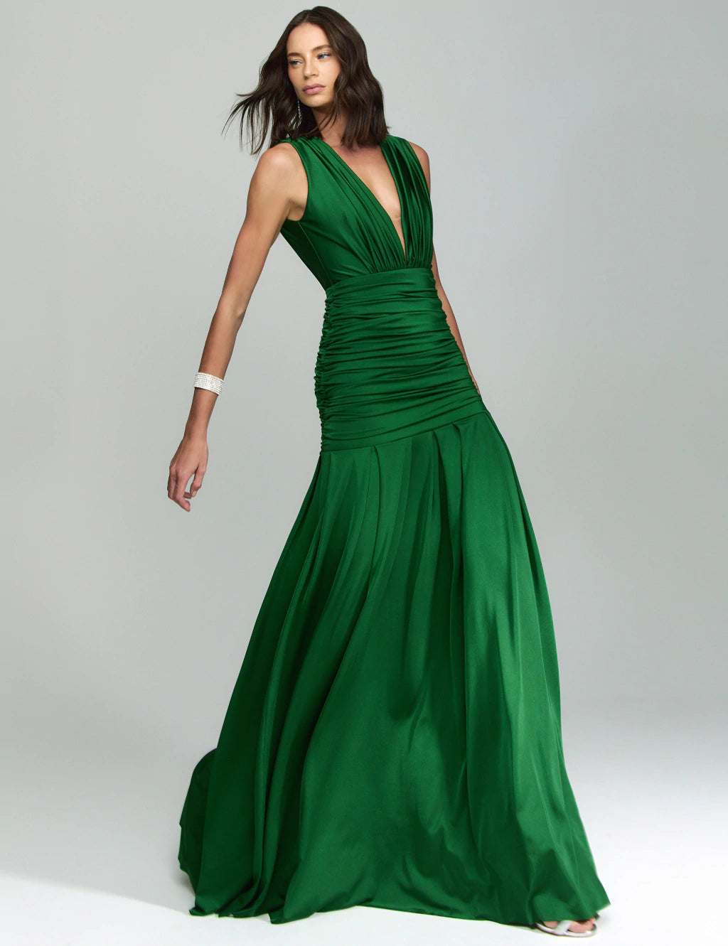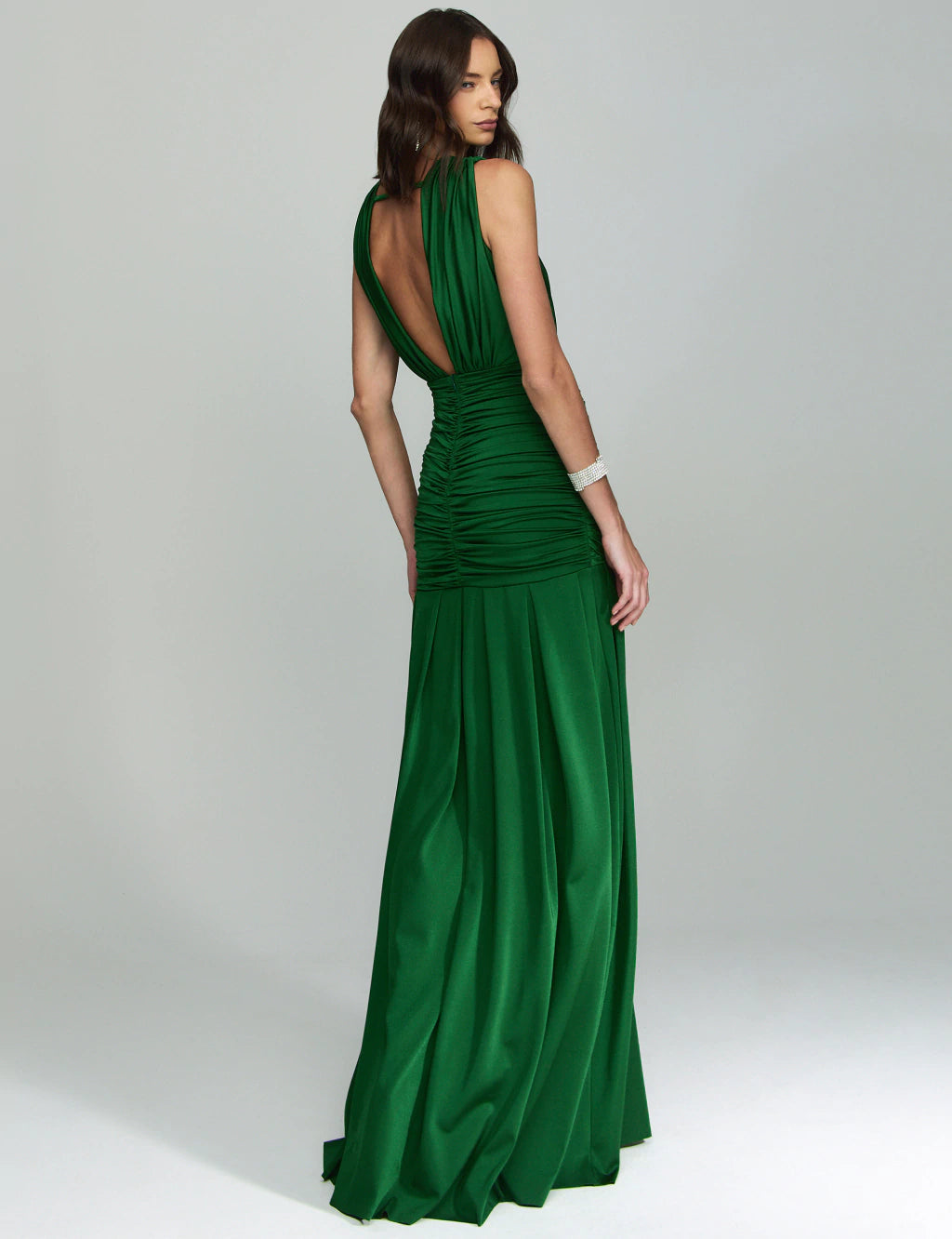 Cette robe longue se distingue par sa taille finement drapée et