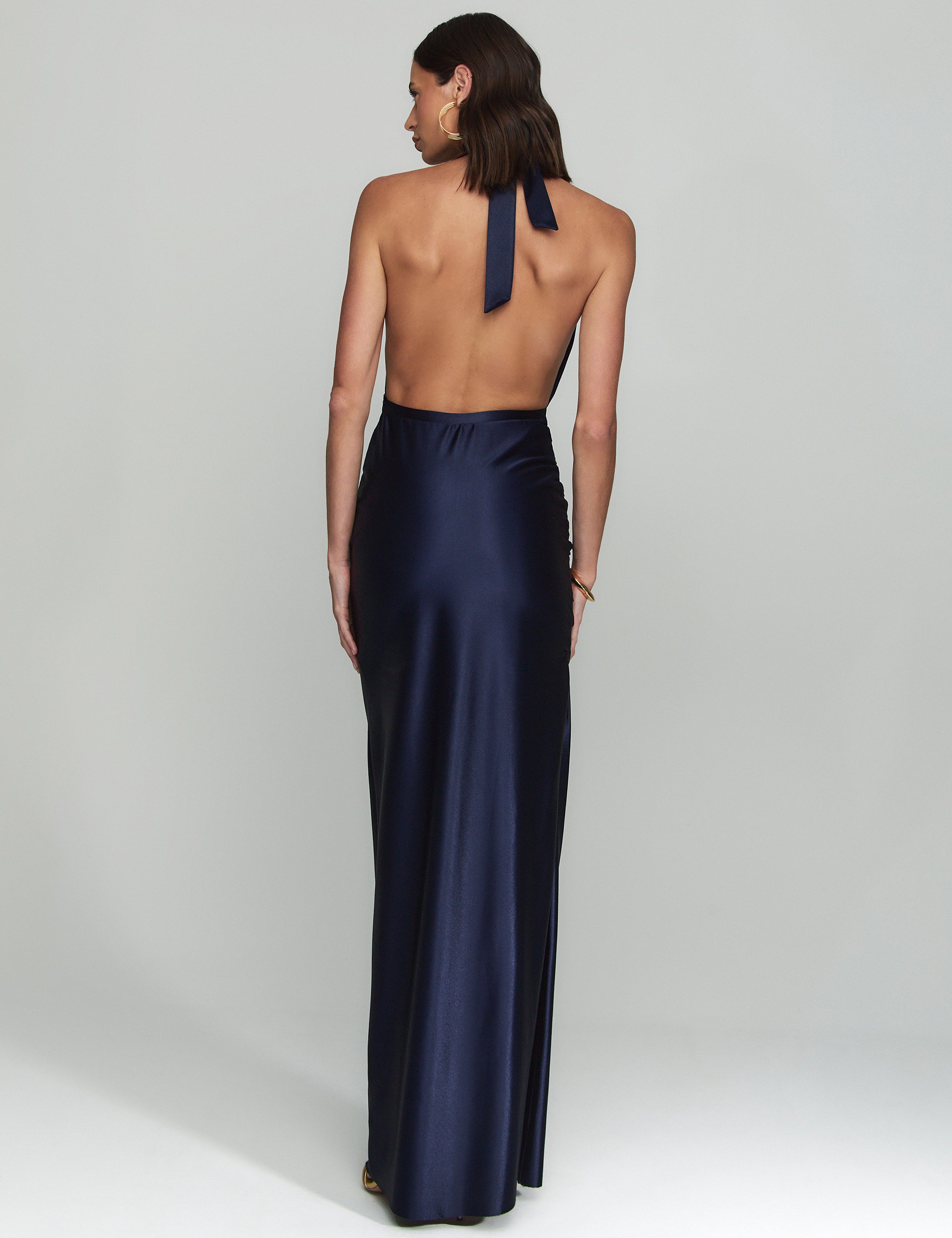 Robe longue dos nu, cintrée, avec un décolleté plongeant