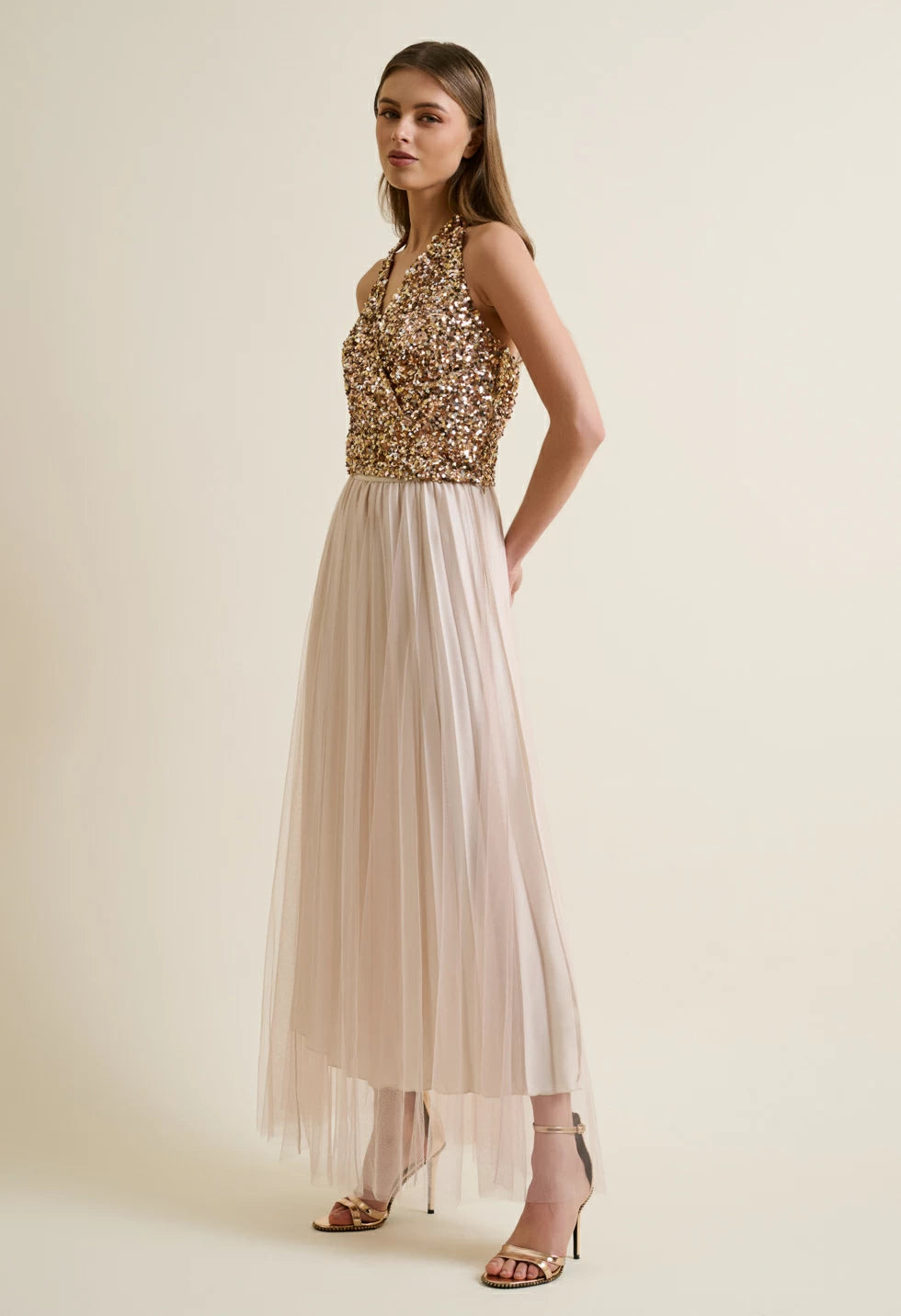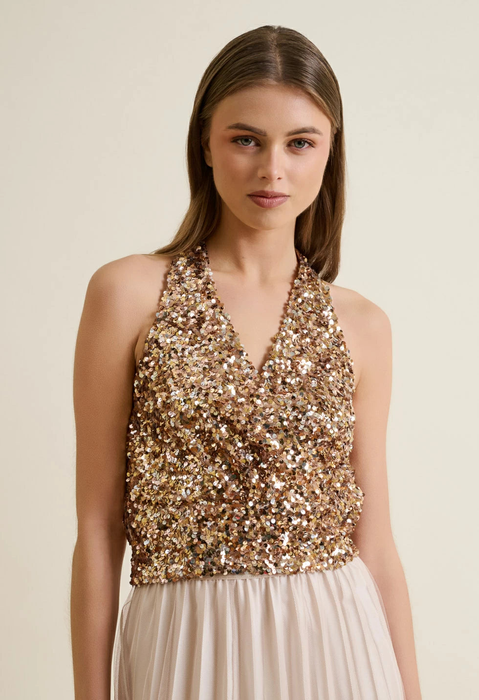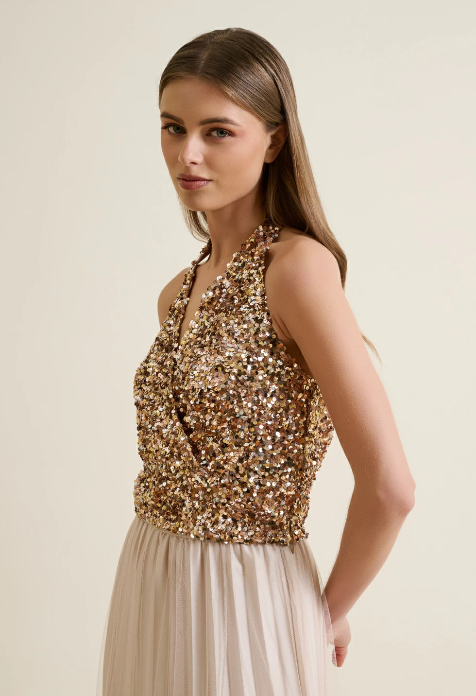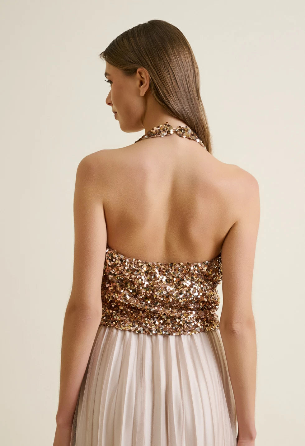 Fermeture par bouton à l'arrière du cou, doublé, coupe droite.