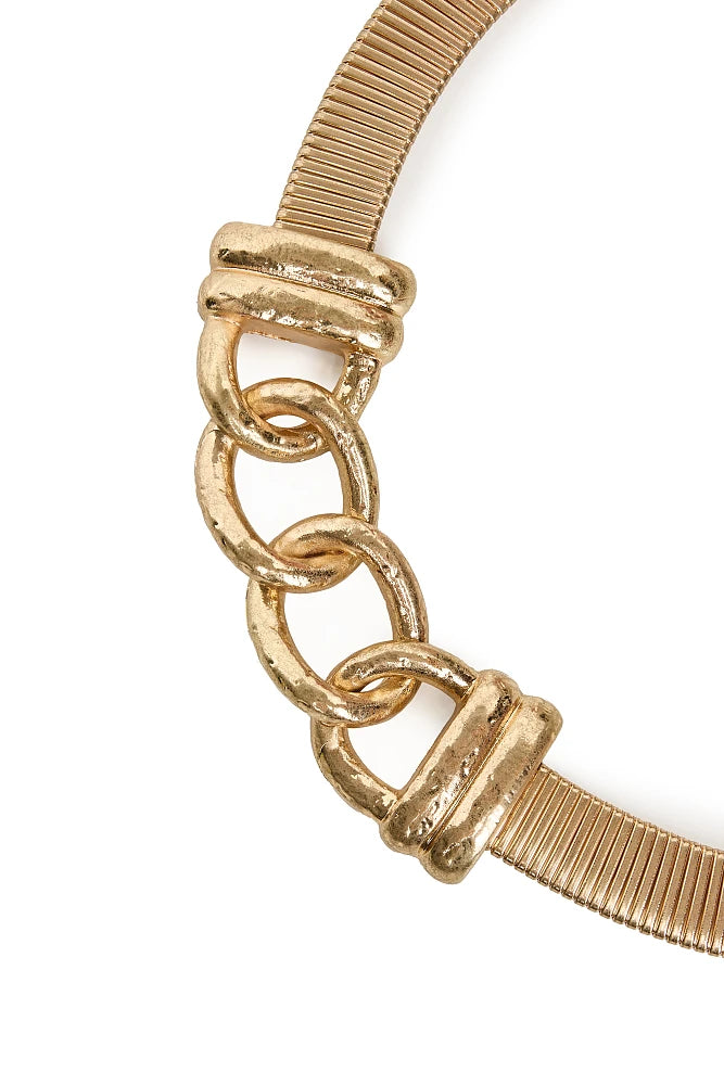 Ceinture élastiquée dorée avec chaînon bijoux à l'avant, alliant confort et élégance.