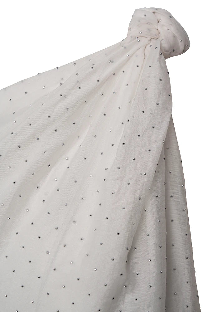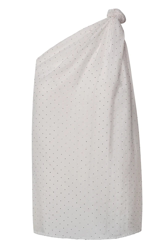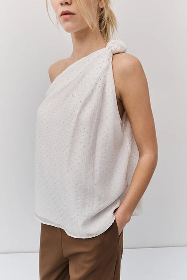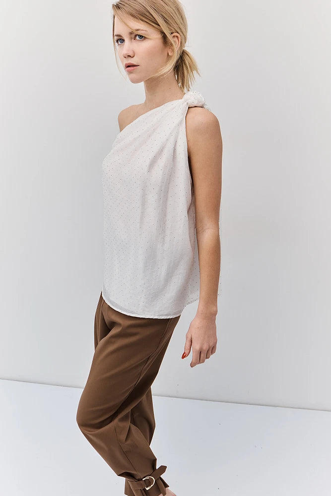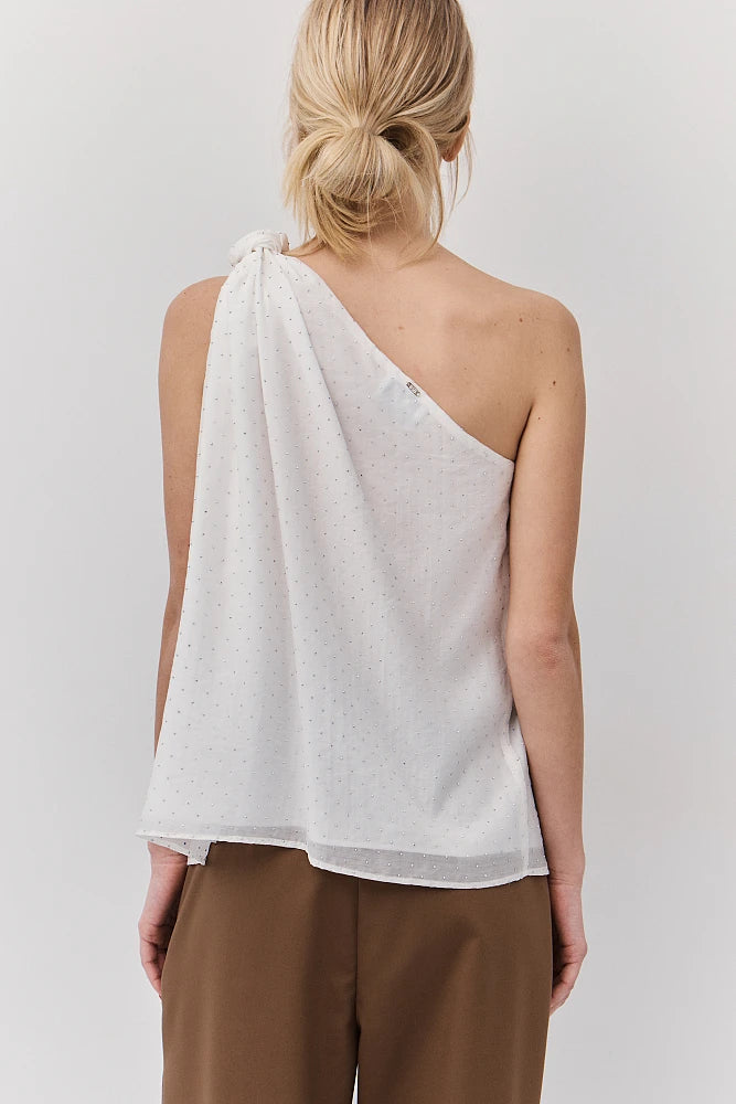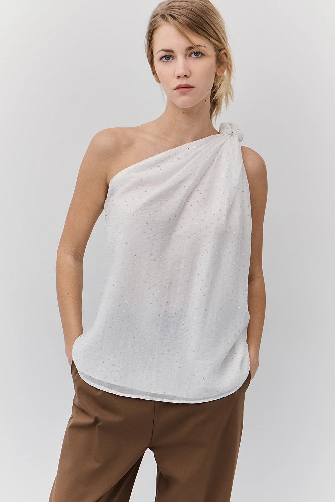 Blouse doublée avec épaule asymétrique . Le nœud noué sur une seule épaule crée une silhouette fluide et floutante. Les minuscules cristaux argentés illuminent cette pièce faussement sage. Parfaite pour celles qui transforment chaque instant en moment de style.