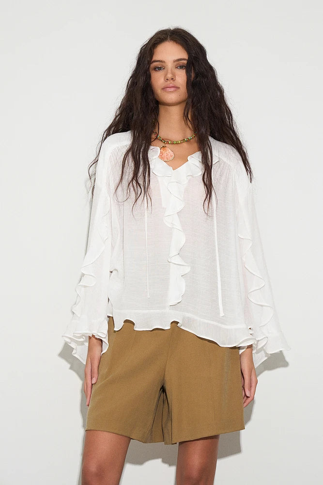 Blouse à volants sur le décolleté et sur les manches.