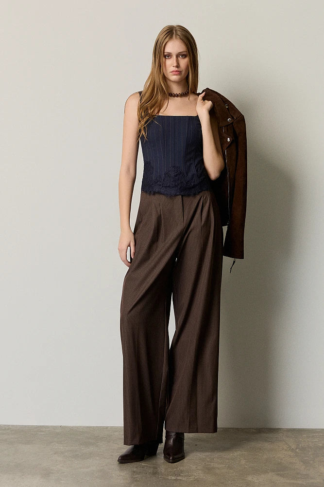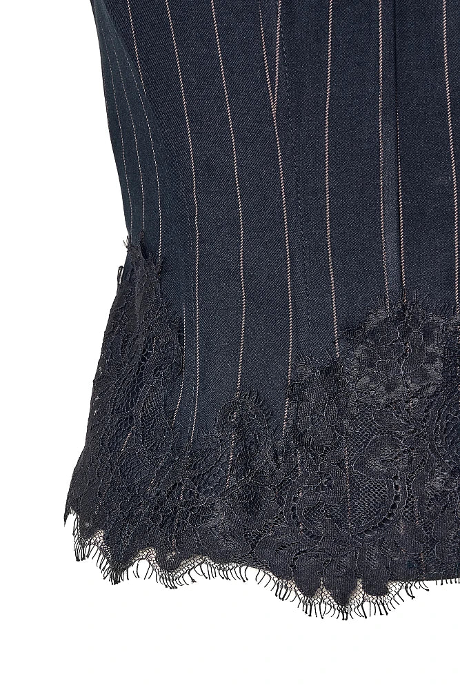 Le bas orné de dentelle délicate contraste avec le tissu rayé masculin, tandis que la fermeture éclair dorsale accentue le dos.