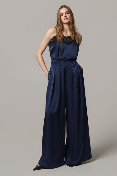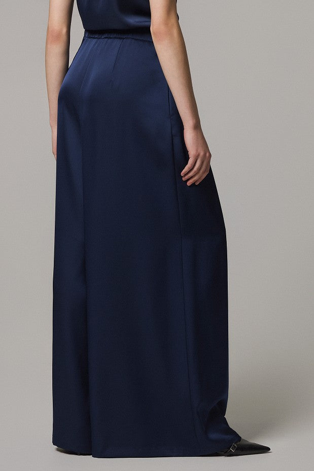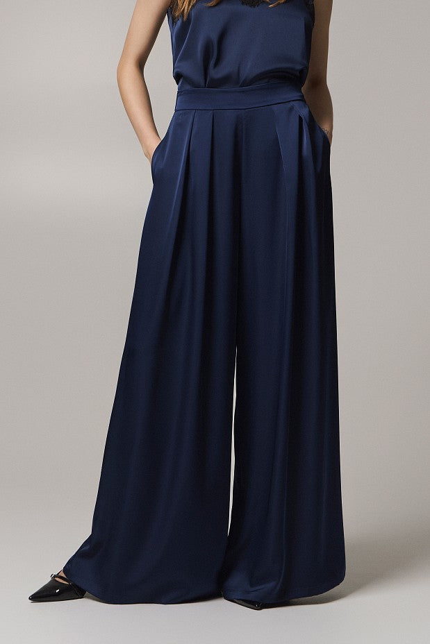 Élégant pantalon en satin aux jambes amples, rehaussé de plis structurés et d'une taille haute élégante.