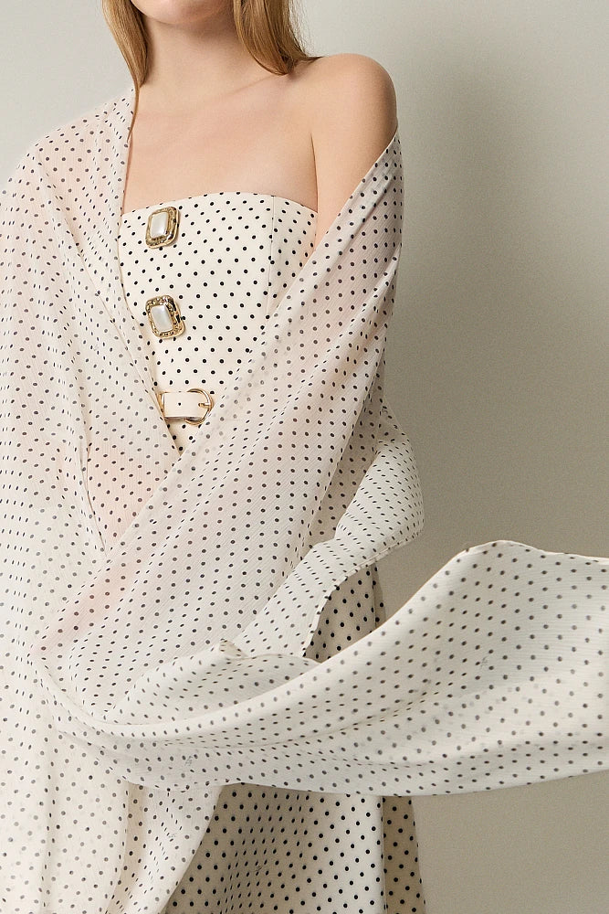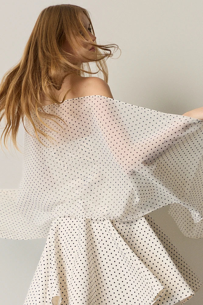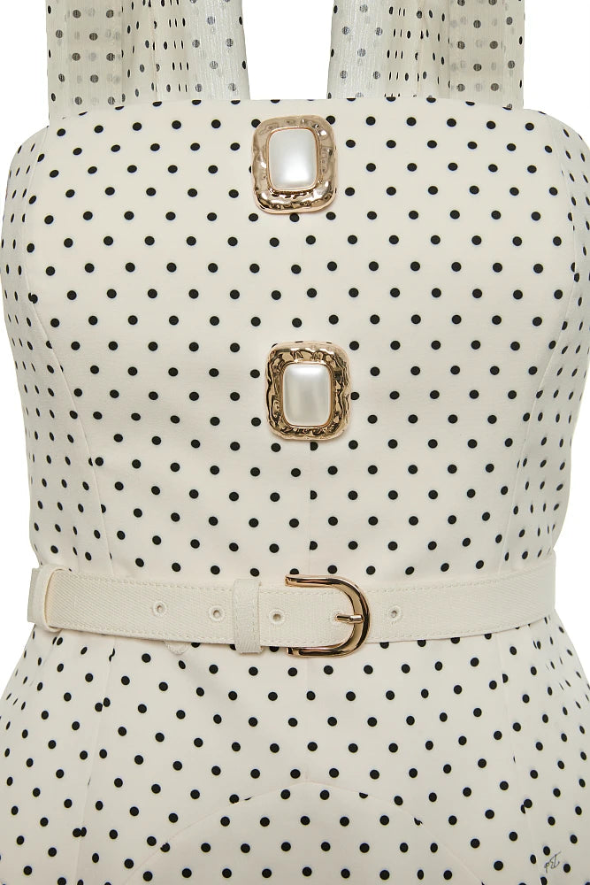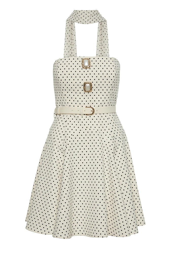 Robe courte au charme rétro affichant un délicat motif petit pois sur tissu fluide.