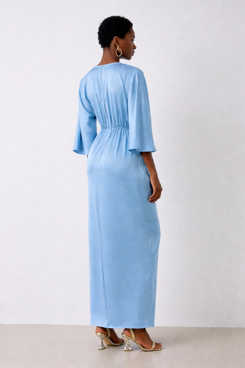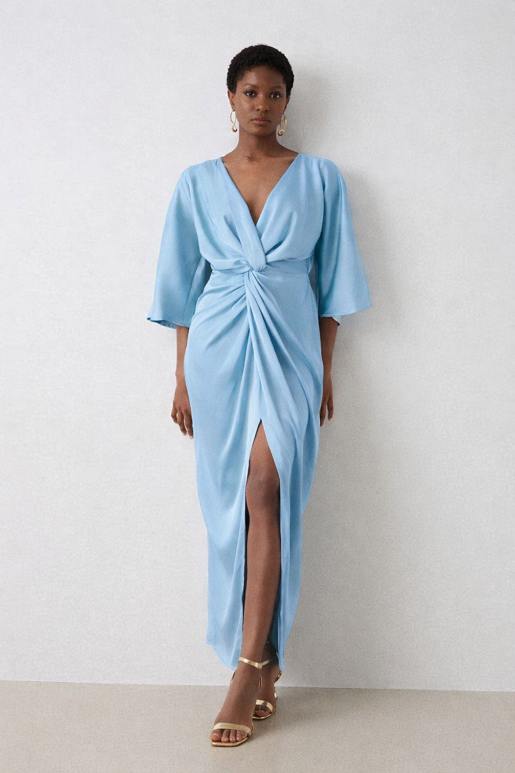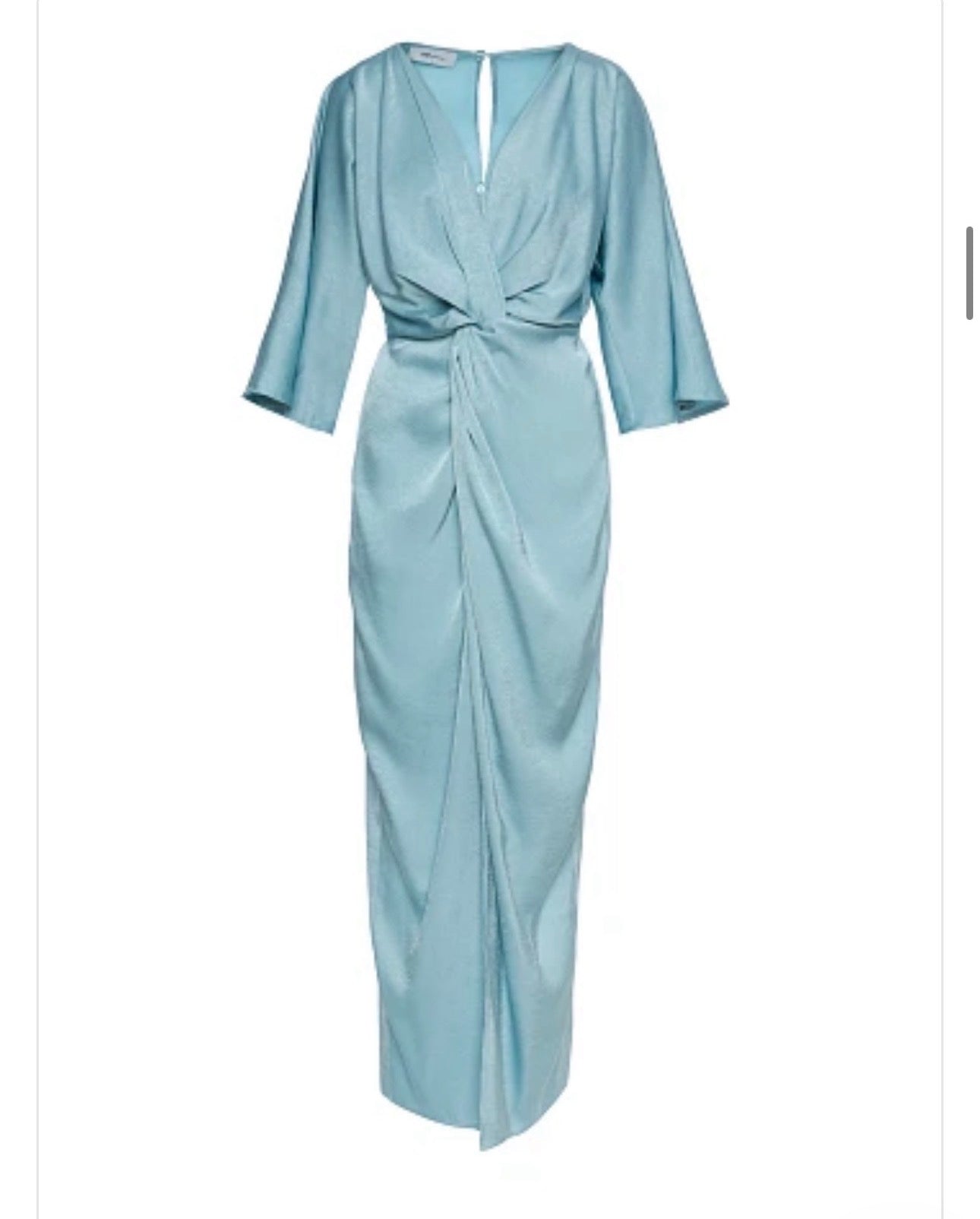 Cette robe longue offre une silhouette flatteuse avec son drapé noué avant , son décolleté en V et ses manches 3/4.