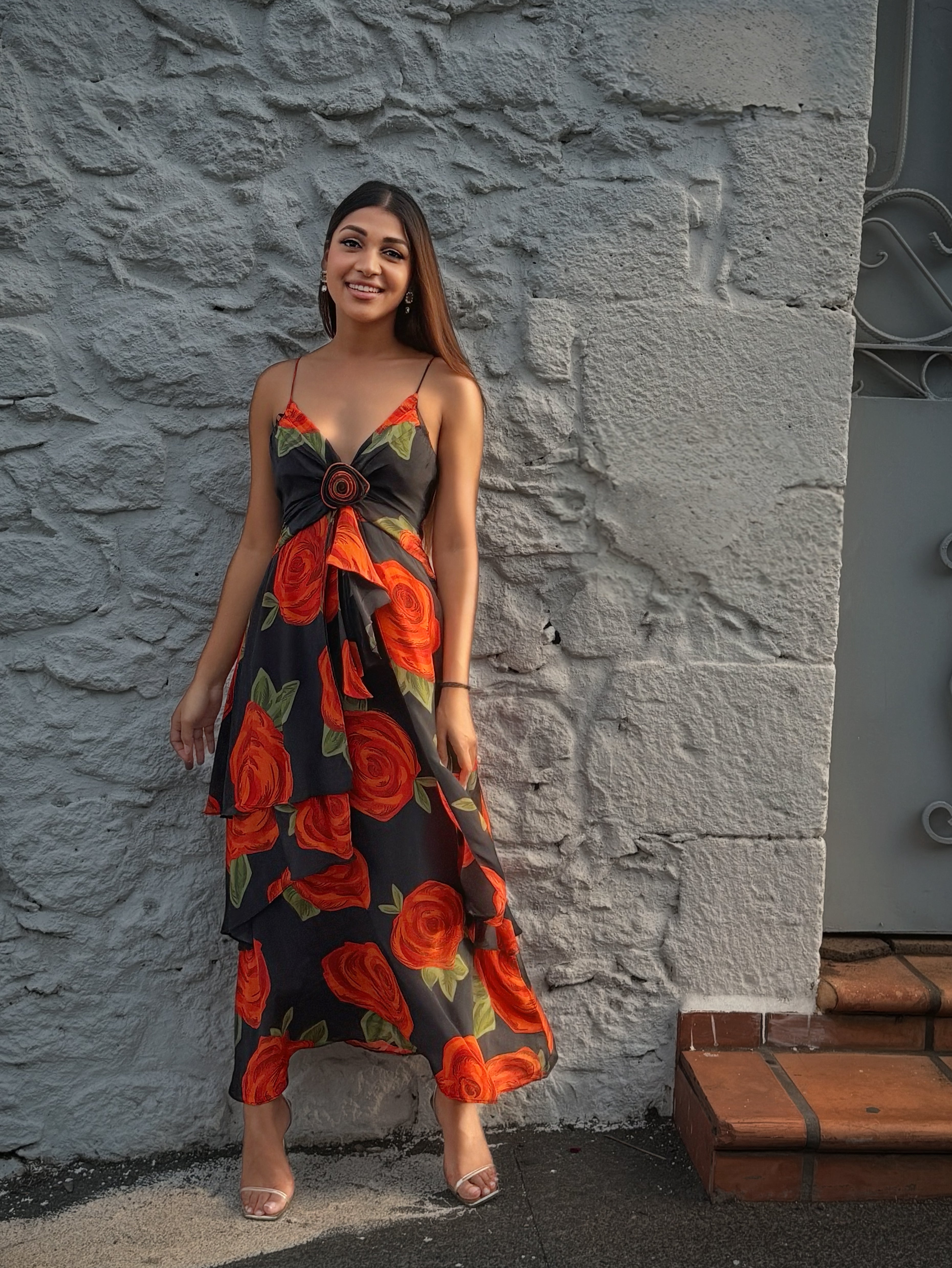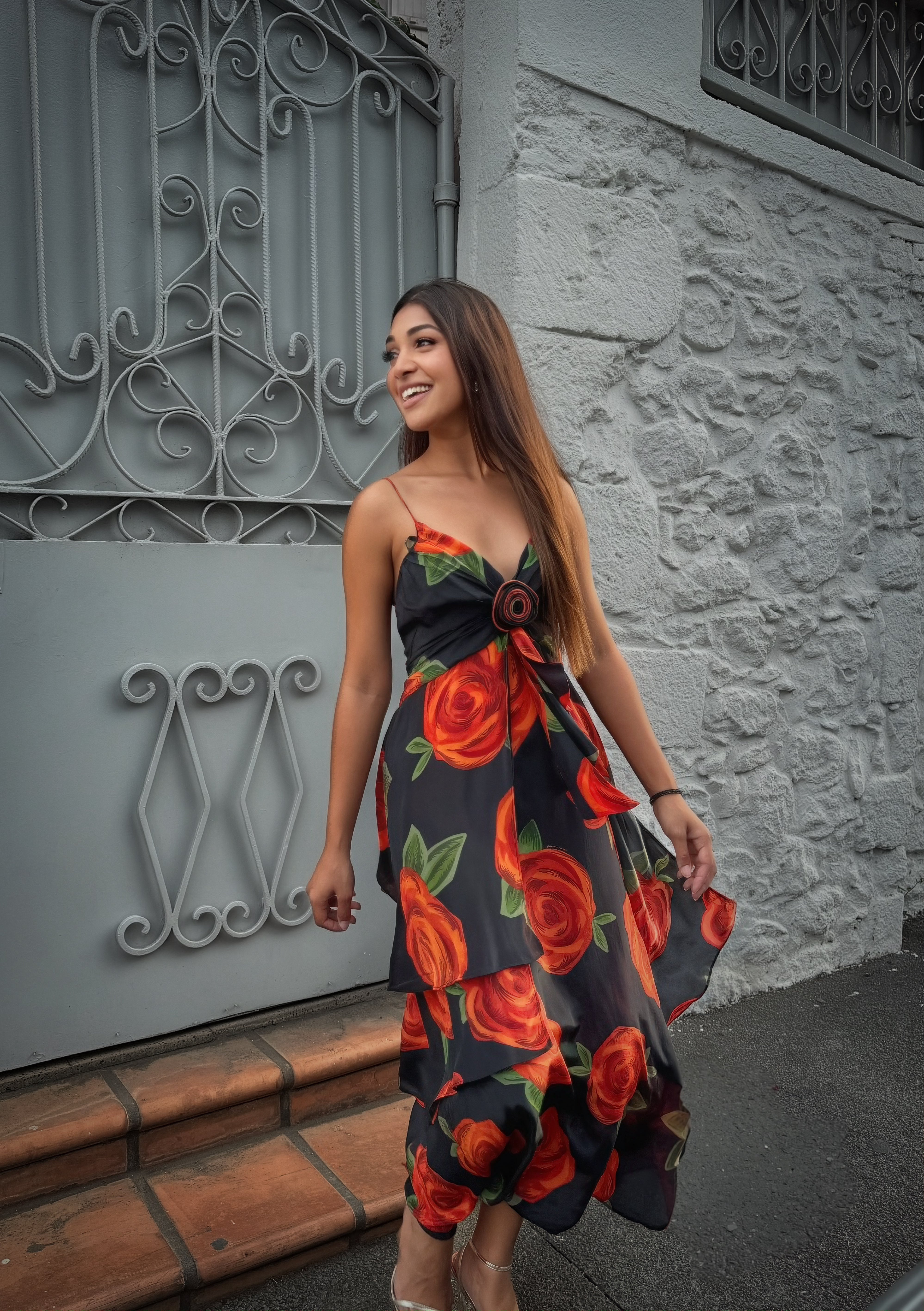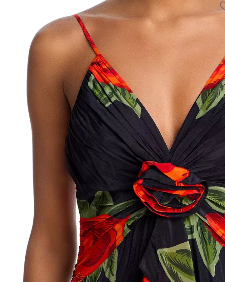 De fines bretelles sublimes le décolleté en V, tandis que le détail central une rose tridimensionnelle attire le regard sur une silhouette fluide et superposée.