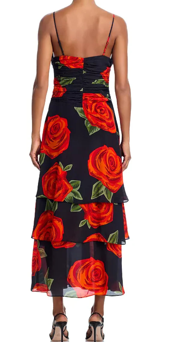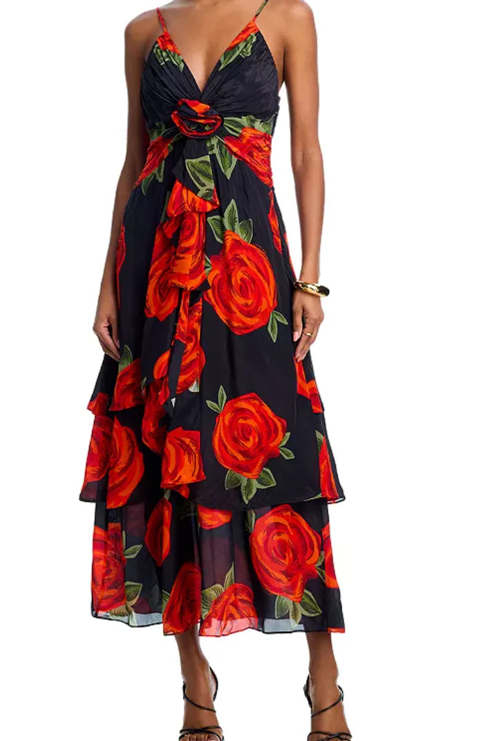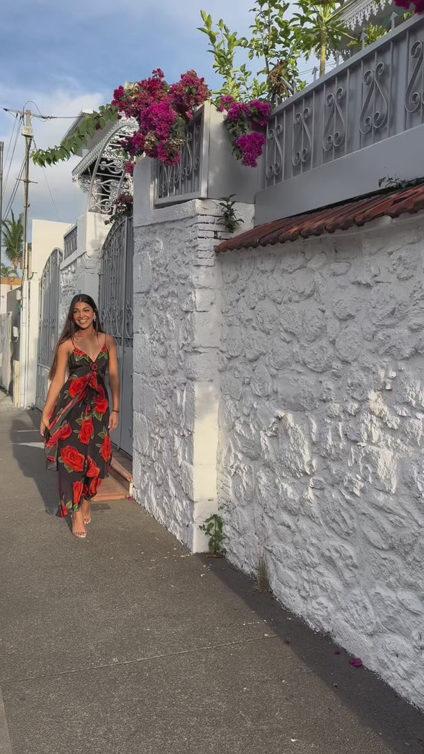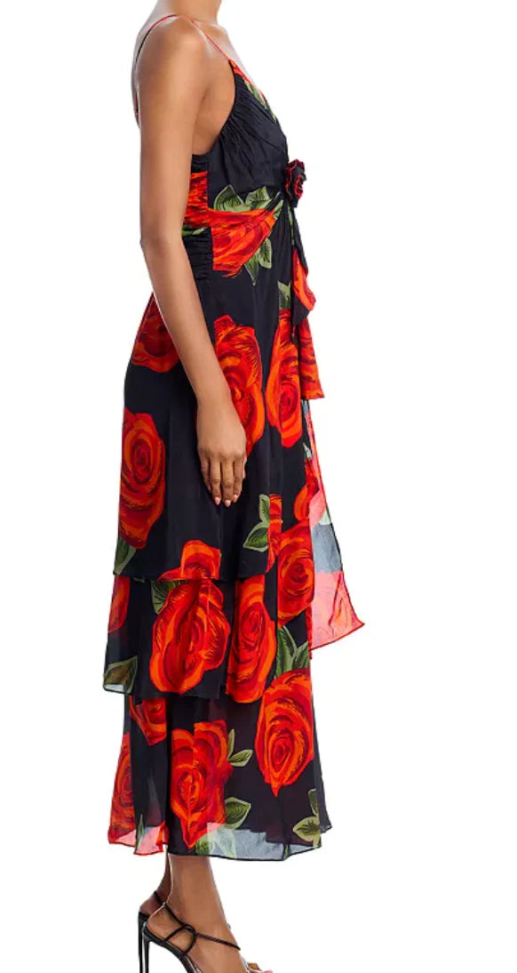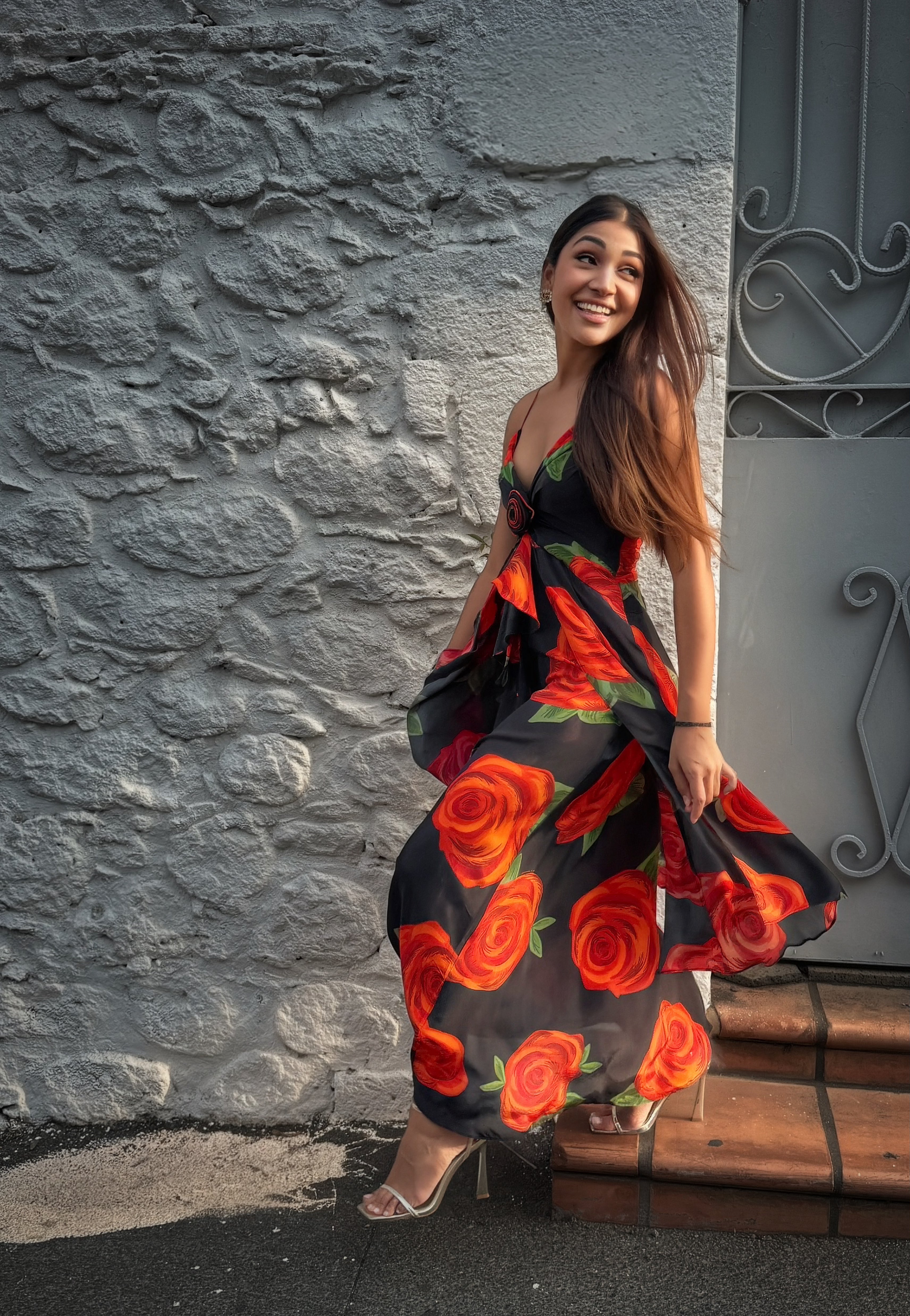 De fines bretelles sublimes le décolleté en V, tandis que le détail central une rose tridimensionnelle attire le regard sur une silhouette fluide et superposée.