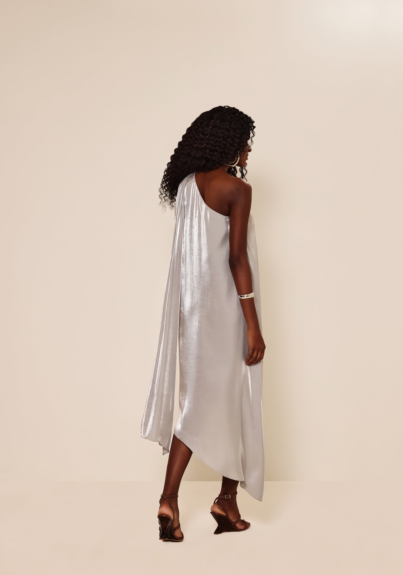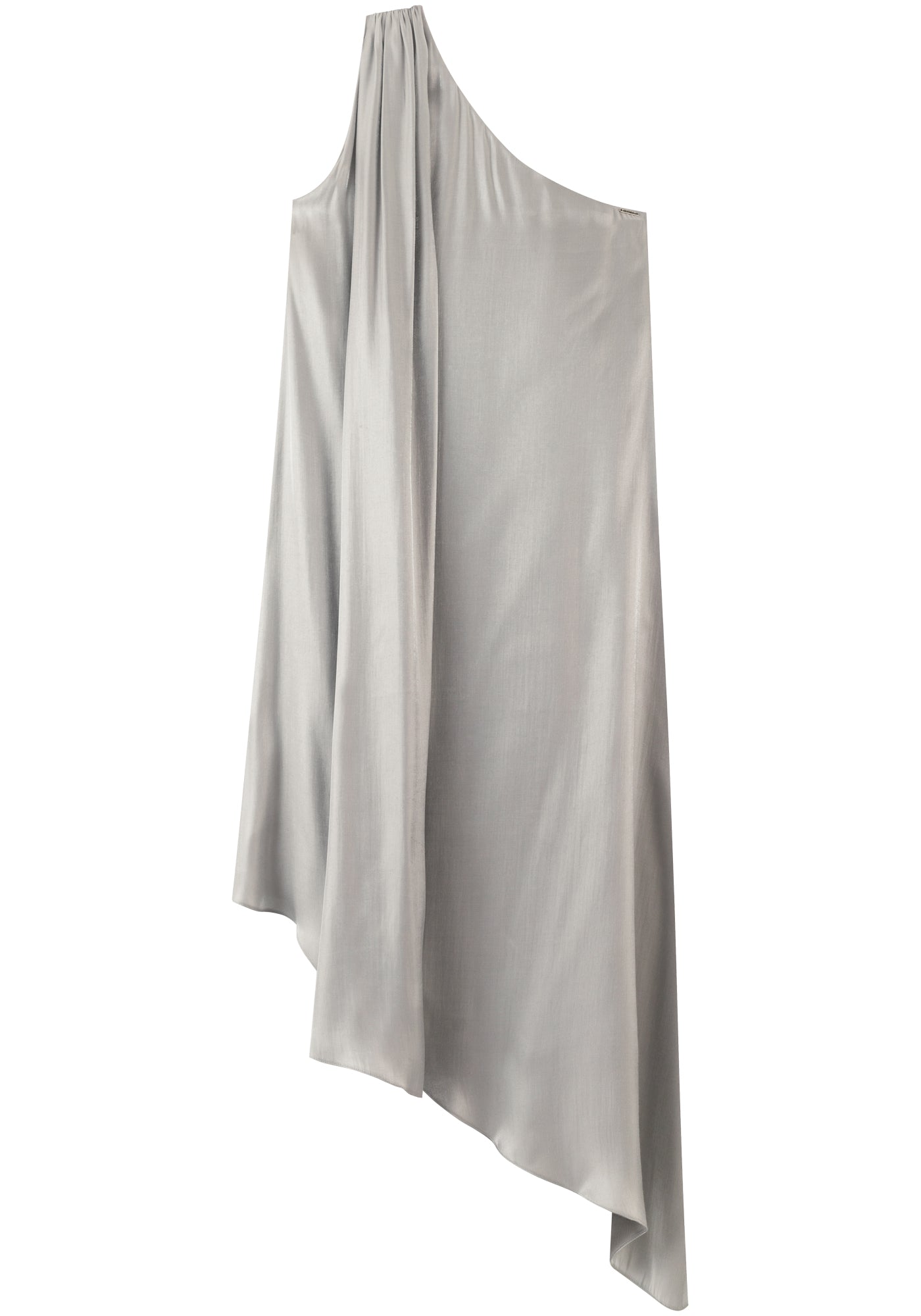 Avec sa coupe asymétrique et son épaule délicate ornée d’une écharpe aérienne,