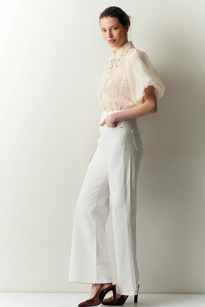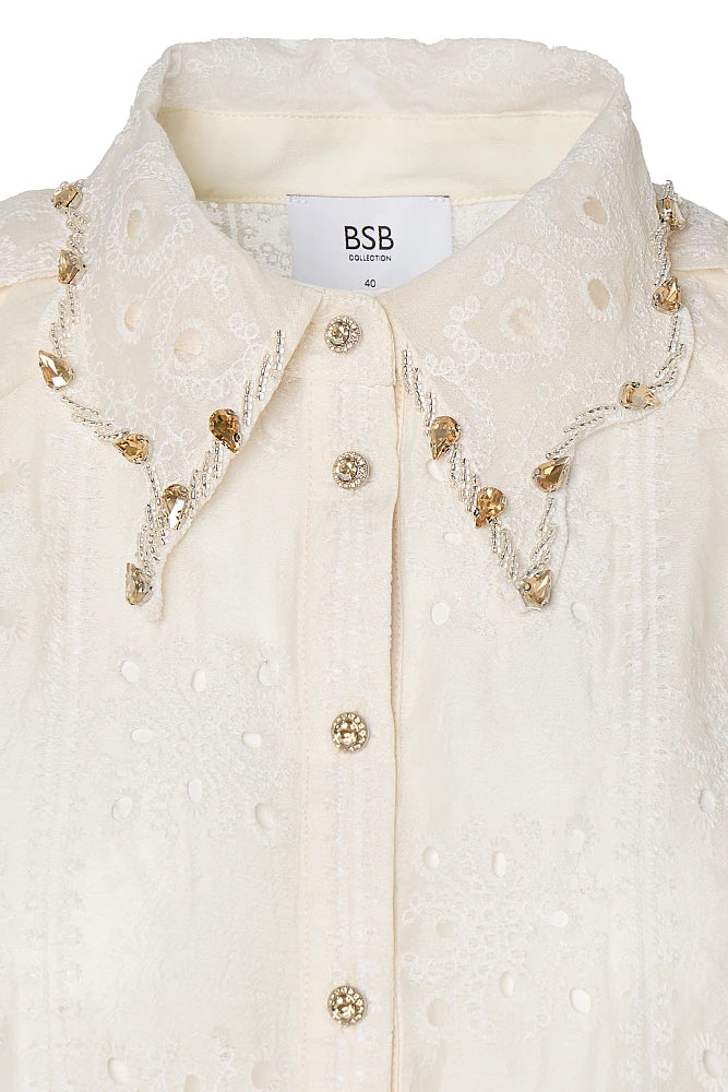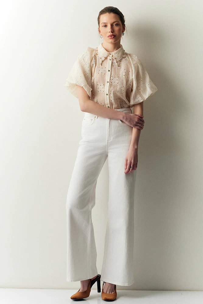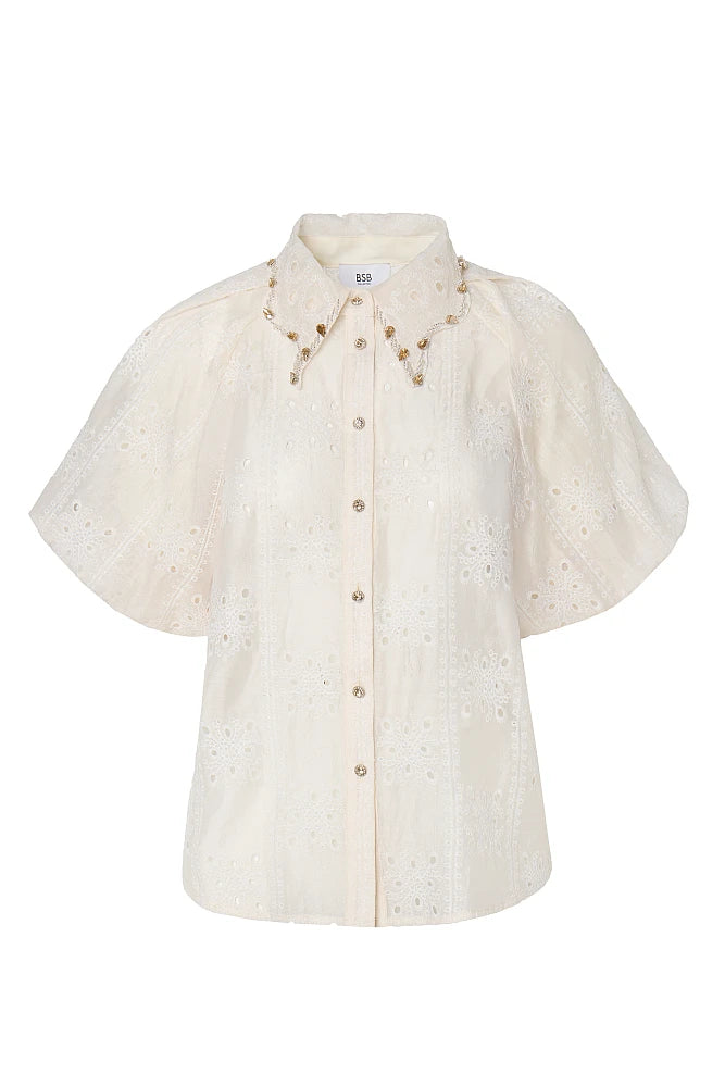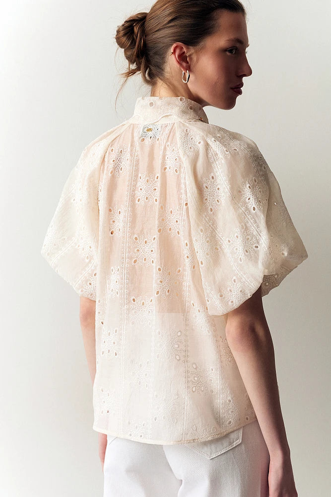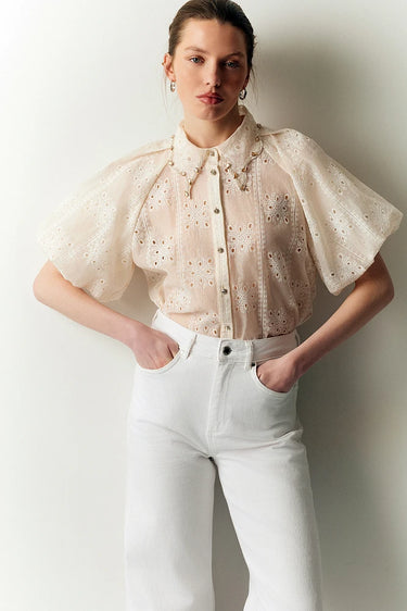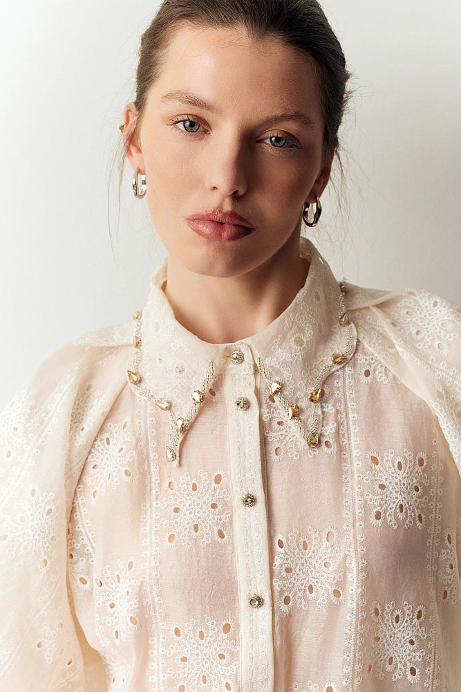 Confectionné dans une dentelle fluide et légère, il séduira par ses manches ballons généreuses et son col orné de cristaux scintillants.